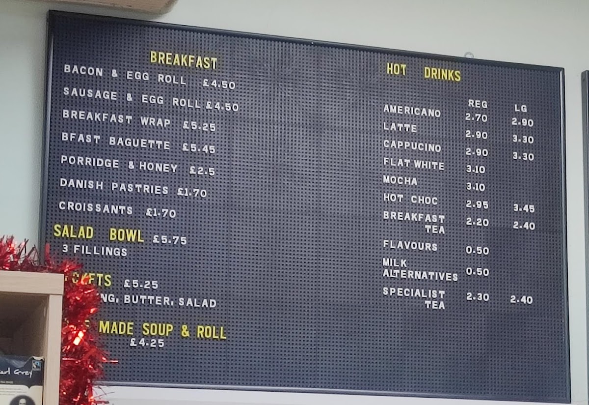 Breakfast selections include classic items such as Bacon & Egg Roll, Sausage & Egg Roll, Breakfast Wrap, Bfast Baguette, Porridge with Honey, Danish Pastries, Croissants, and Salad Bowls. These options cater to both traditional and lighter morning meals.